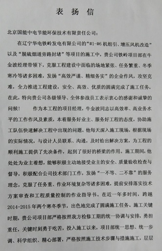 公司遼寧華電鐵嶺EPC項目受業主表揚